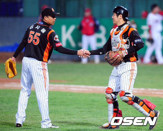 20일 오후 광주 무등야구장에서 열린 '2012 팔도 프로야구' KIA 타이거즈와 롯데 자이언츠의 경기 종료후 김사율과 강민호가 악수를 하고 있다.