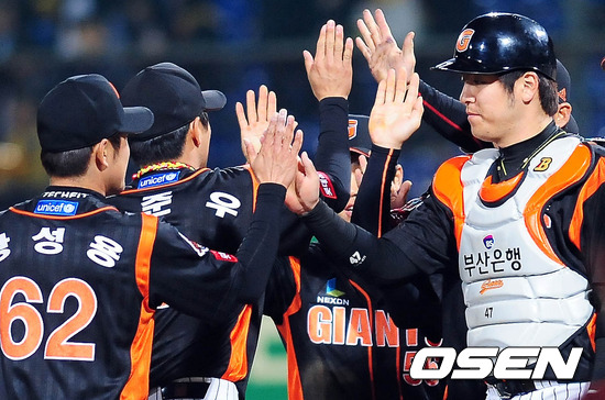 20일 오후 광주 무등야구장에서 열린 '2012 팔도 프로야구' KIA 타이거즈와 롯데 자이언츠의 경기 종료후 롯데 선수들이 승리를 기뻐하며 하이파이브를 하고 있다.