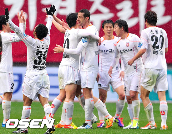 제주 21일 오후 서울월드컵경기장에서 열린 2012시즌 현대오일뱅크 K리그 9라운드에서 후반 31분 김현성에 선제골을 내준 채 후반 추가시간까지 끌려갔지만 경긱 종료 직전 기적 같은 산토스의 골로 1-1 무승부를 기록하며 승점 3점과도 같은 승점 1점을 챙겼다.