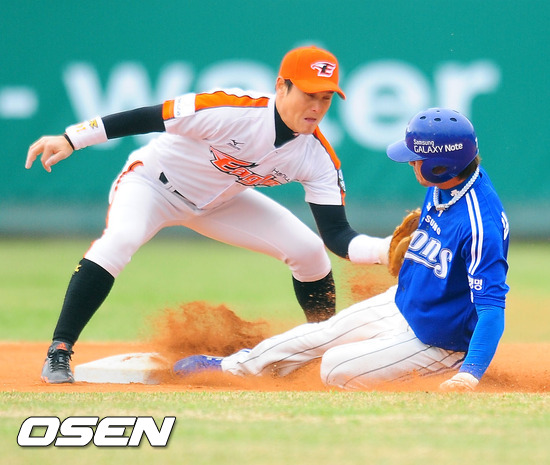22일 오후 충청북도 청주구장에서 열린 '2012 팔도 프로야구' 한화 이글스와 삼성 라이온즈의 경기에서 1회초 1사 주자 1루 삼성 이승엽 타석에서 1루 주자 김상수가 2루 도루에 실패하고 있다.