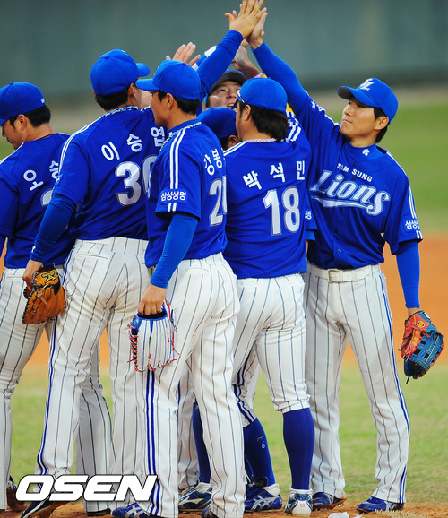 경기를 마치고 삼성 선수들이 마운드 근처에 모여서 하이파이브를 하고 있다. / rumi@osen.co.kr
