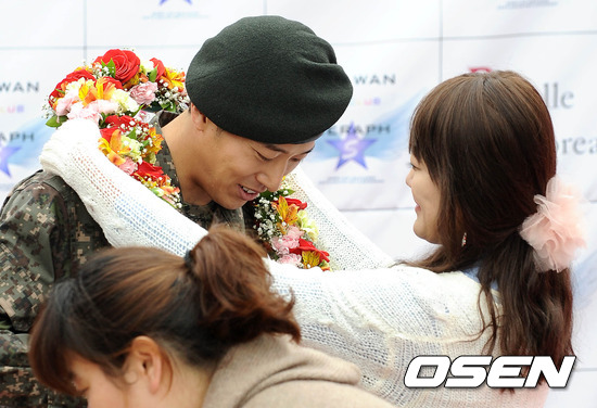 23일 오전 서울 용산구 국방부 청사 서문에서 약 2년간의 군 복무를 마치고 전역한 배우 이완이 한 여성팬의 꽃목걸이 선물을 받고 있다.