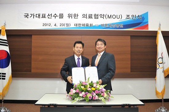 대한체육회(회장:박용성)가 국가대표 선수들의 부상 치료를 위한 목적으로 바른세상병원(원장:서동원)과 의료협약(MOU)을 체결했다.