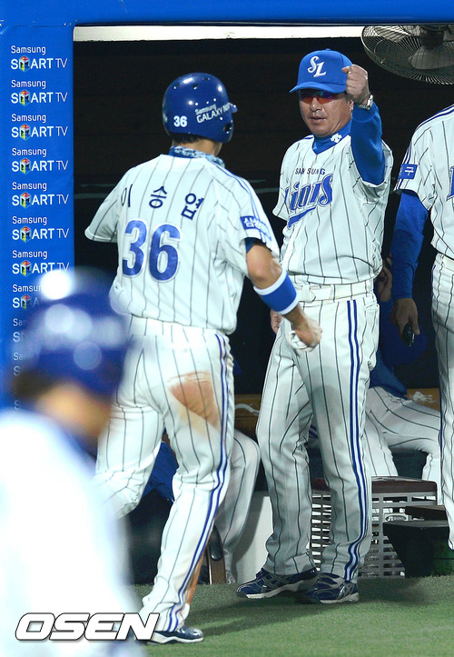 24일 오후 대구야구장에서 열린 '2012 팔도 프로야구' 삼성 라이온즈와 롯데 자이언츠의 경기, 6회말 2사 1,3루 삼성 채태인 타석때 더블스틸에 성공한 삼성 이승엽이 더그아웃에서 류중일 감독의 축하를 받고 있다.
