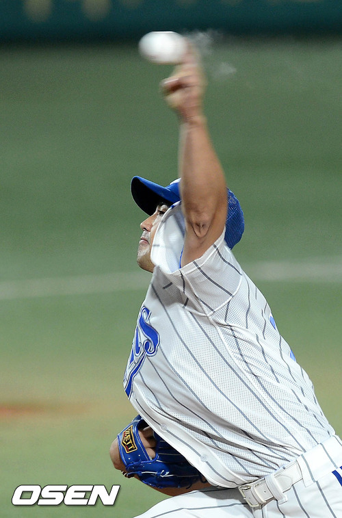 24일 오후 대구야구장에서 열린 '2012 팔도 프로야구' 삼성 라이온즈와 롯데 자이언츠의 경기, 7회초 무사 1루 롯데 손아섭 타석때 삼성 윤성환과 교체된 장원삼이 힘차게 공을 던지고 있다.