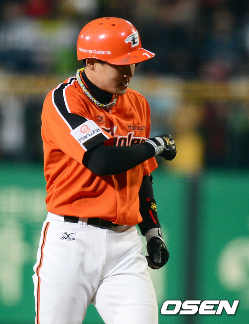 24일 오후 광주구장에서 열린 '2012 팔도 프로야구' KIA 타이거즈와 한화 이글스의 경기, 6회초 2사 2루에서 한화 이여상이 1타점 적시타를 날리고 기뻐하고 있다.