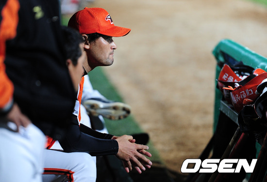 24일 오후 광주구장에서 열린 '2012 팔도 프로야구' KIA 타이거즈와 한화 이글스의 경기, 5회말 무사 1,2루에서 강판된 한화 박찬호가 더그아웃에서 경기를 지켜보고 있다.