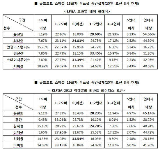 유선영 외에 HSBC 여자오픈 준우승을 차지한 펑샨샨(51.26%)의 언더파 예상이 높게 집계된 반면, 최나연(44.39%), 서희경(40.62%), 안젤라스탠퍼드(36.73%), 스테이시루이스(32.95%)의 1라운드 언더파 예상은 비교적 낮게 나타났다.