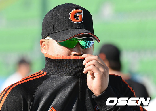 26일 오후 대구야구장에서 열린 '2012 팔도 프로야구' 삼성 라이온즈와 롯데 자이언츠의 경기에 앞서 롯데 홍성흔이 재킷의 지퍼를 올리고 있다.