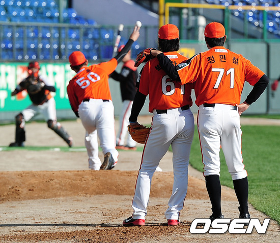 26일 오후 광주구장에서 열린 '2012 팔도 프로야구' KIA 타이거즈와 한화 이글스의 경기에 앞서 한화 박찬호와 정민철 코치가 양훈의 불펜 피칭을 바라보고 있다.