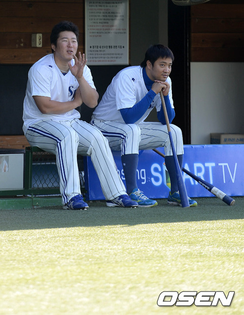 26일 오후 대구야구장에서 열린 '2012 팔도 프로야구' 삼성 라이온즈와 롯데 자이언츠의 경기에 앞서 삼성 최형우와 채태인이 훈련 중인 선수들을 바라보고 있다.