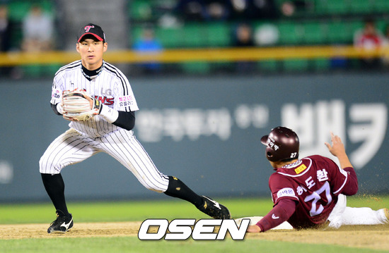 26일 잠실구장에서 열린 '2012 팔도 프로야구' LG 트윈스와 넥센 히어로스의 경기 5회초 1사 1루 장기영 보내기 번트때 1루 주자 허도환 2루에서 포스아웃 되고 있다.