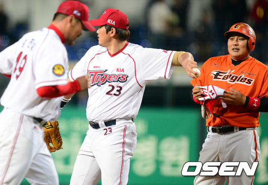 26일 오후 광주구장에서 열린 '2012 팔도 프로야구' KIA 타이거즈와 한화 이글스의 경기, 5회초 2사 1루에서 한화 김태균이 강판당한 KIA 김진우을 바라보고 있다.
