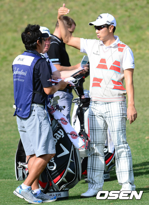 유럽프로골프(EPGA) 투어 제5회 발렌타인 챔피언십 2라운드 경기가 27일 오전 경기도 이천시 블랙스톤 골프 클럽에서 열려 배상문이 14번홀에서 세컨샷을 치기 전 캐디와 이야기를 나누고 있다.