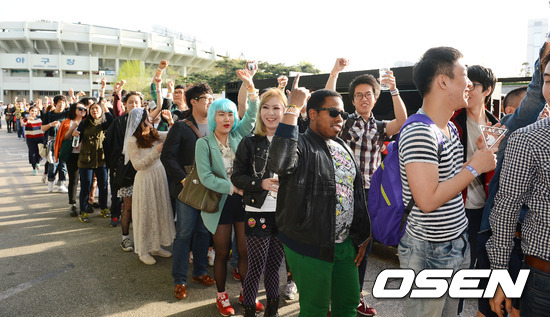 27일 오후 서울 잠실종합운동장에서 '현대카드 슈퍼콘서트 16 - 레이디 가가 내한공연 (Lady Gaga The Born This Way Ball)'가 열릴 예정인 가운데 독특한 의상을 입은 팬들이 이른 시간부터 모여 공연을 기다리고 있다.
