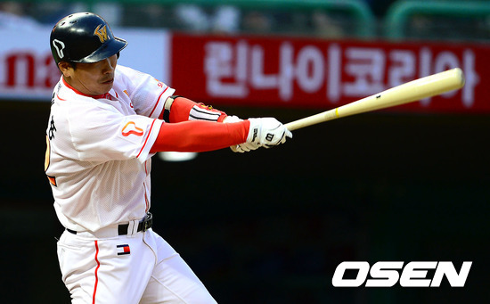 27일 오후 인천 문학구장에서 열린 2012 팔도 프로야구 SK 와이번스와 삼성 라이온즈의 경기 2회말 1사 1루 SK 박재홍이 2루타를 날리고 있다