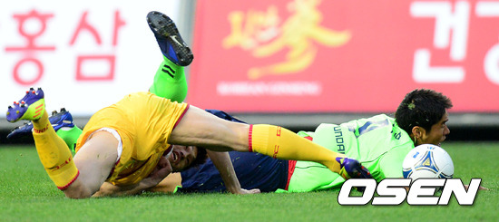 전반 전북 정성훈과 광주 김은선이 몸싸움 과정에서 걸려 넘어지고 있다.