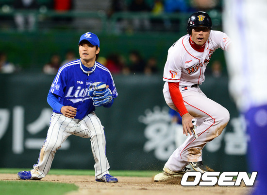 27일 오후 인천 문학구장에서 열린 2012 팔도 프로야구 SK 와이번스와 삼성 라이온즈의 경기 6회말 1사 1루 SK 최윤석의 타석때 1루 주자 박정권이 도루 시도해 2루에 세이프되고 있다.
