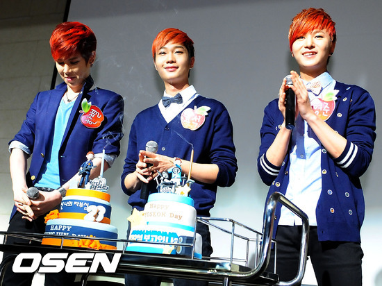 28일 오후 종로구 둘로스 소극장에서 진행된 그룹 레드애플(Led apple) '영준&효석 DAY 팬미팅' 에서 레드애플 멤버 영준가 효석이 케이크 불을 끄고 난 후 웃고 있다.