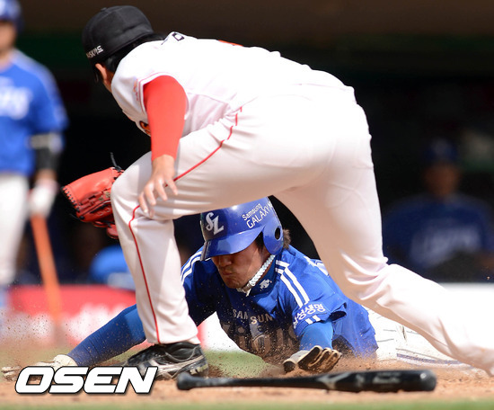 29일 오후 인천 문학야구장에서 열린 '2012 팔도 프로야구' SK 와이번스와 삼성 라이온즈의 경기 5회초 1사 3루 이승엽의 내야땅볼때 3루주자 김상수가 홈을 파고들고 있다. 3루수 최정의 송구를 홈 커버를 들어온 김태훈 투수가 놓쳐 세이프 됐다.