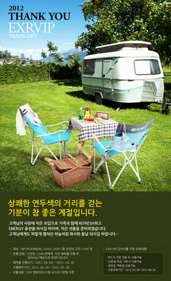 EXR은 VIP 고객 중 1,000명을 선정하여 가족과 함께 화사한 봄날을 즐길 수 있도록 특별 제작한 캠핑 의자 및 전국 대리점과 백화점에서 사용할 수 있는 3만원 할인 쿠폰을 증정한다.