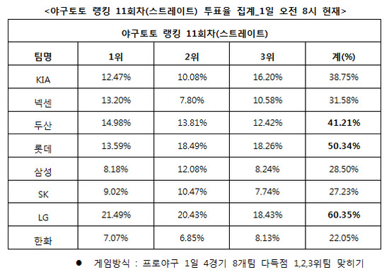 2012 프로야구 대상 야구토토 랭킹 11회차 투표율 중간집계 결과