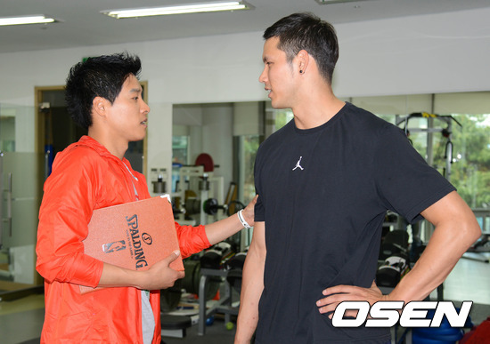 1일 오후 경기도 안양실내체육관에서 진행된 남자 농구 대표팀 합동훈련에서 우지원 코치가 이승준의 팔을 만져보고 있다.