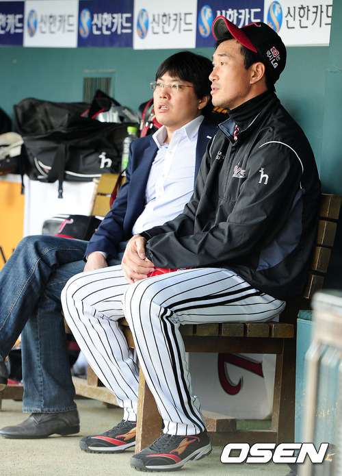 경기전 LG 봉중근이 더그아웃에서 이야기를 나누고 있다.