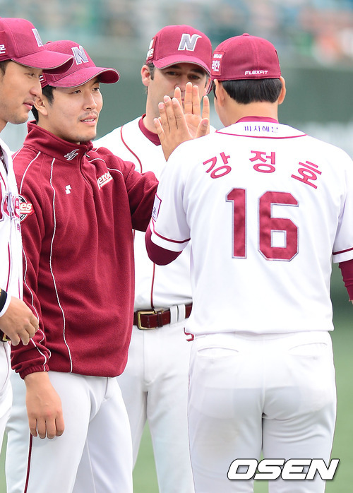 1일 오후 서울 잠실구장에서 열린 '2012 팔도 프로야구' 넥센 히어로즈와 롯데 자이언츠의 경기에서 넥센 김병현이 4월 MVP 시상식에서 수상을 한 강정호와 하이파이브를 하고 있다.