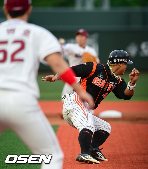 1일 오후 서울 잠실구장에서 열린 '2012 팔도 프로야구' 넥센 히어로즈와 롯데 자이언츠의 경기에서 1회초 1사 주자 1,3루 롯데 박종윤 타석에서 1루 주자 홍성흔이 도루를 시도하였으나 협살 위기에 몰리고 있다.