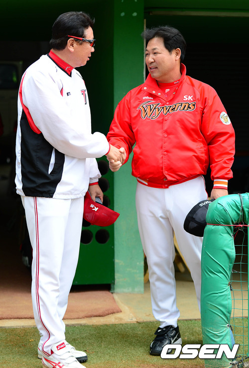2일 오후 광주구장에서 열리는 '2012 팔도 프로야구' KIA 타이거즈와 SK 와이번스의 경기 시작전 선동렬 감독과 이만수 감독이 악수를 나누고 있다.