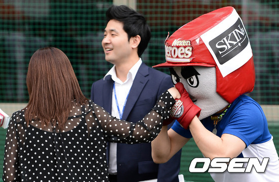 2일 오후 서울 목동야구장에서 열린 '2012 팔도 프로야구' 넥센 히어로즈와 롯데 자이언츠의 경기에 앞서 넥센 턱돌이가 XTM 인윤정 아나운서에게 장난을 치고 있다.