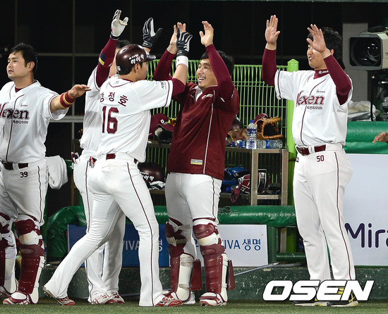 2일 오후 서울 목동야구장에서 열린 '2012 팔도 프로야구' 넥센 히어로즈와 롯데 자이언츠의 경기, 6회말 2사 넥센 강정호가 중월 홈런을 치고 더그아웃에서 동료들의 축하를 받고 있다.