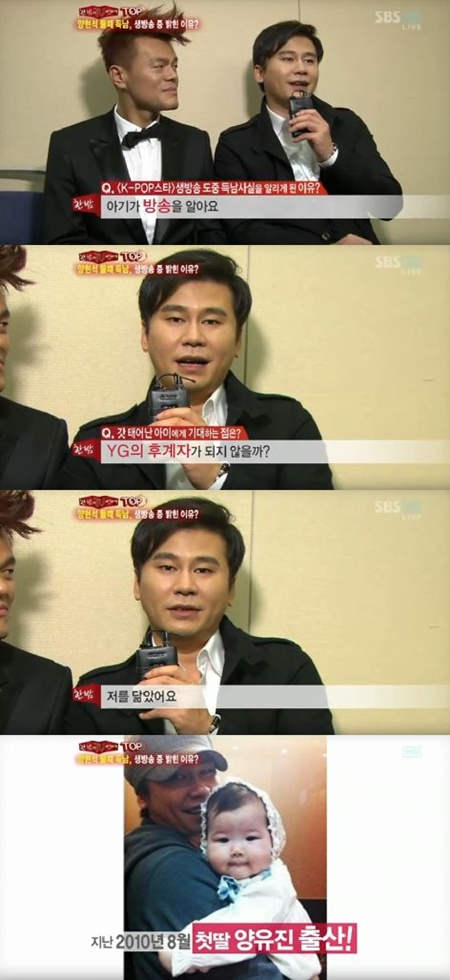 이날 양현석은 태어난 아들에 대해 "아기가 방송을 안다. 'K팝스타' 방송하기 이틀 전에 태어났다. 친한 박진영 씨 앞에서 처음 이야기하고 싶어 언론에도 미리 공개하지 않았다. 참느라 힘들었다"고 덧붙이며 득남 소감을 전했다.