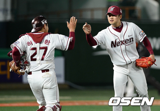 경기 종료 후 넥센 허도환과 손승락이 하이파이브를 하고 있다. / sunday@osen.co.kr
