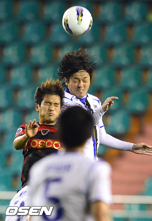 후반 포항 황지수와 감바 엔도가 공중볼을 다투고 있다 /soul1014@osen.co.kr