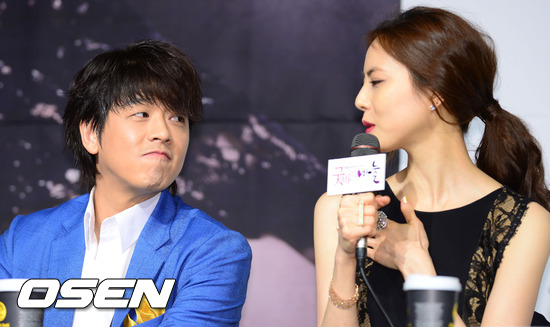 3일 오후 라마다 서울 호텔에서 열린 종합편성채널 채널 A의 새 월화드라마 '굿바이 마눌'(극본 김도현 연출 김평중)의 제작보고회에서 류시원 말을 하고 있는 박지윤을 바라보고 있다.