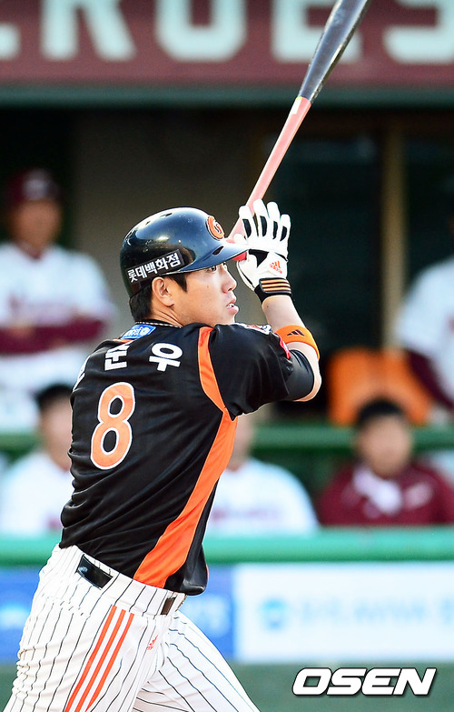3일 오후 서울 목동구장에서 열린 '2012 팔도 프로야구' 넥센 히어로즈와 롯데 자이언츠의 경기 1회초 1사 주자 2루 롯데 전준우가 우익수 앞 1타점 선취 적시타를 날리고 있다.