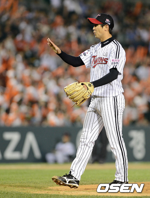 3일 오후 서울 잠실야구장에서 열린 '2012 팔도 프로야구' LG 트윈스와 한화 이글스의 경기, 5회초 2사 LG 김광삼이 한화 신경현에게 몸에 맞는 볼을 던지고 사과하고 있다.