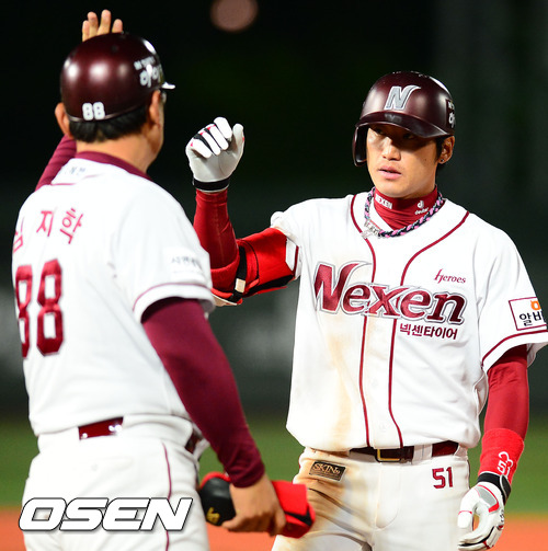 3일 오후 서울 목동구장에서 열린 '2012 팔도 프로야구' 넥센 히어로즈와 롯데 자이언츠의 경기 5회말 2사 주자 2루 넥센 장기영이 좌중간 1타점 역전 적시타를 날린 후 1루에서 심재학 코치와 하이파이브를 하고 있다.