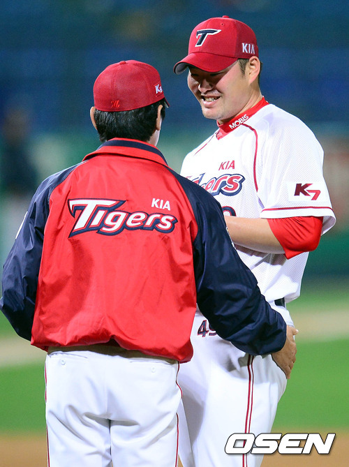 3일 오후 광주구장에서 열린 '2012 팔도 프로야구' KIA 타이거즈와 SK 와이번스의 경기 6회초 2사 1루 김진우가 마운드를 내려가며 미소를 짓고 있다.