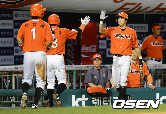3일 오후 서울 잠실야구장에서 열린 '2012 팔도 프로야구' LG 트윈스와 한화 이글스의 경기, 6회말 1사 만루 한화 김경언의 1타점 적시타때 홈을 밟은 2루주자 강동우와 2루주자 장성호가 더그아웃에서 동료들의 축하를 받고 있다.