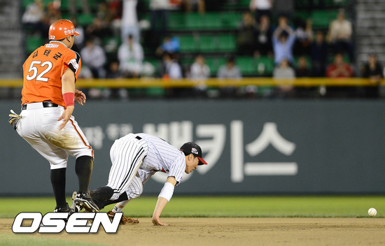 3일 오후 서울 잠실야구장에서 열린 '2012 팔도 프로야구' LG 트윈스와 한화 이글스의 경기, 6회말 1사 만루 한화 김경언의 2타점 적시타때 LG 김일경이 공은 놓치고 있다.