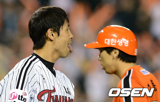 3일 오후 서울 잠실야구장에서 열린 '2012 팔도 프로야구' LG 트윈스와 한화 이글스의 경기, 6회초 1사 만루 한화 고동진의 내야땅볼때 수비 실책으로 1점을 허용한 LG 김광삼이 아쉬워하고 있다.