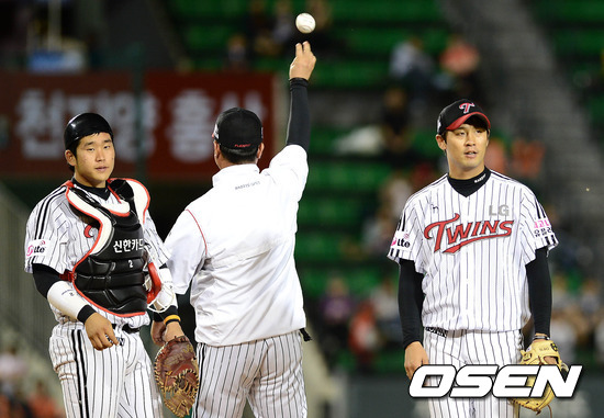 3일 오후 서울 잠실야구장에서 열린 '2012 팔도 프로야구' LG 트윈스와 한화 이글스의 경기, 6회초 2사 2,3루 한화 신경현 타석때 LG 김광삼이 마운드를 내려가고 있다.