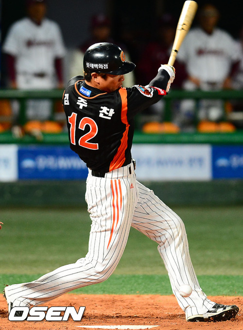 3일 오후 서울 목동구장에서 열린 '2012 팔도 프로야구' 넥센 히어로즈와 롯데 자이언츠의 경기 7회초 2사 주자 만루 롯데 김주찬의 타구가 자신의 발에 맞고 있다.