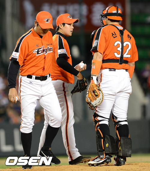 3일 오후 서울 잠실야구장에서 열린 '2012 팔도 프로야구' LG 트윈스와 한화 이글스의 경기, 6회말 2사 1루 한화 유창식이 마운드를 내려가고 있다.