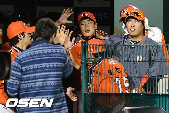 3일 오후 서울 잠실야구장에서 열린 '2012 팔도 프로야구' LG 트윈스와 한화 이글스의 경기, 6회말 2사 1루 한화 류현진이 마운드에서 내려 온 유창식을 격려하고 있다.