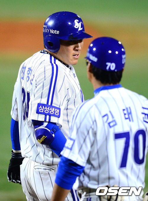 3일 오후 대구구장에서 열리는 2012 팔도 프로야구 삼성 라이온즈와 두산 베어스의 경기 5말 1사 1,3루 삼성 최형우가 1타점 적시타를 날린 후 김태균 코치와 하이파이브를 하고 있다