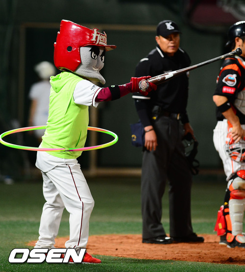3일 오후 서울 목동구장에서 열린 '2012 팔도 프로야구' 넥센 히어로즈와 롯데 자이언츠의 경기 7회초 1사 주자 없는 상황에서 턱돌이가 훌라후프를 돌리며 넥센 장기영에게 배트를 주고 있다.
